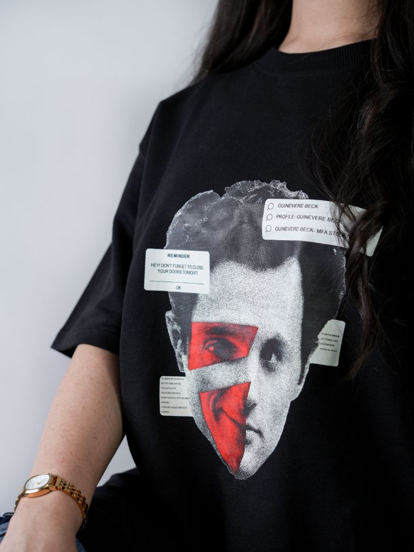 Inspired by the twisted psyche of You's infamous lead, this design blends digital-age obsession with cinematic intensity. The graphic features a split-faced portrait layered with search bars, reminders, and sinister undertones — a nod to modern voyeurism and dual identities.