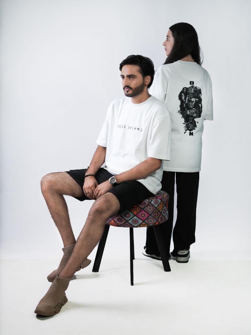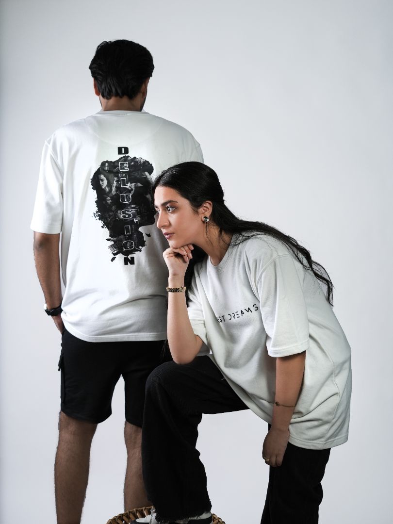 The front features “LOST DREAMS” in crisp high-density print — clean, minimal, and bold. The back steals the show with a collage-style UV-DTF graphic spelling out “DELUSION” — a haunting descent into layered thought and fragmented visuals.